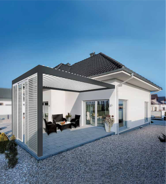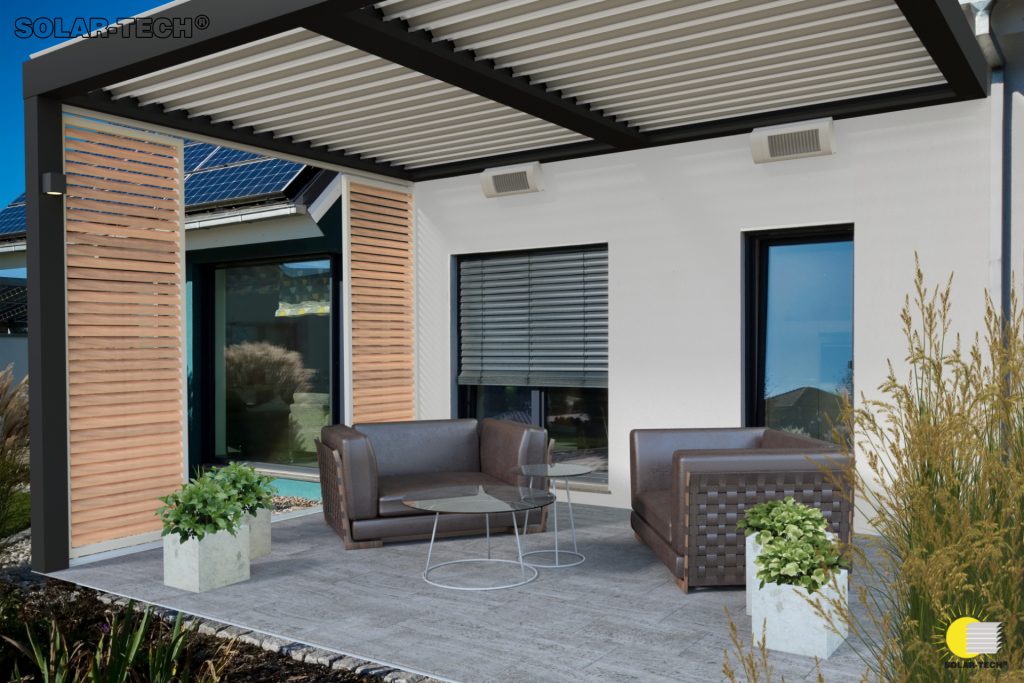 Moderní pergoly nabízí elegantní a praktický stínící střechový systém tvořený otočnými lamelami z extrudovaného hliníku, Díky těmto otočným lamelám je možno dosáhnout potřebného stupně stínění, nezbytné ventilace, ochrany před deštěm a sněhem. Za deště odvádí vodu odvodňovací systém skrytý vpodpěrách a lamelách. Tento systém je funkční i po dešti, kdy zbylou dešťovou vodu po otevření lamel tento odvodňovací systém zachytí, a prostor pod pergolou tak zůstane stále suchý.Naše moderní pergoly poskytují elegantní a jednoduchý design konstrukcí, jenž nenaruší styl žádné – ani tradiční, ani moderní – budovy a který umožňuje nátěry v plném rozsahu barevných odstínů RAL. Lamelové pergoly jsou poháněny motorem s možností napojení na inteligentní ovládání domu či aplikací pro mobilní telefon i tablet s androidem nebo iOS.